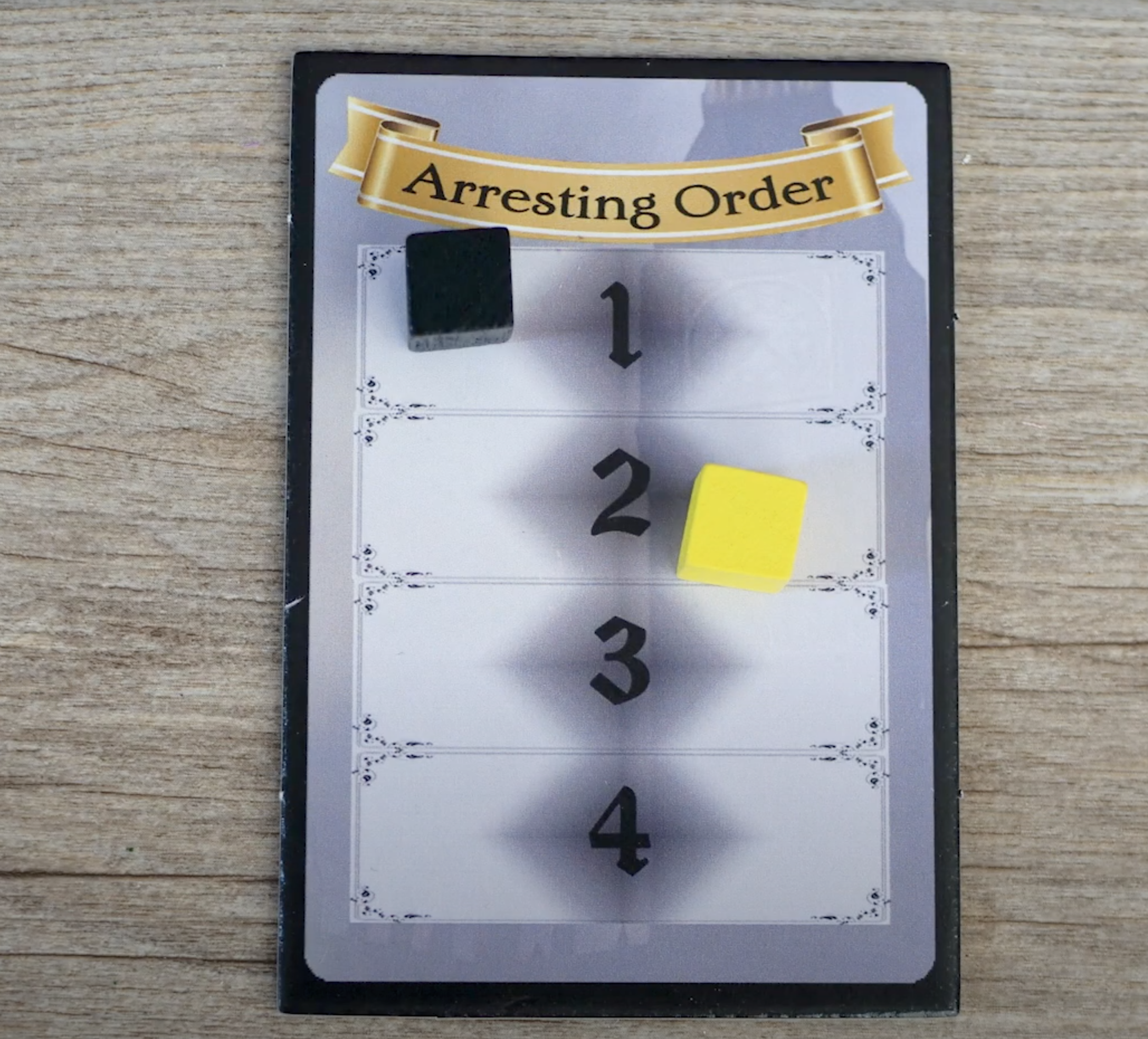 Each player picks a color, grabs the wooden cube and 13 BSI tokens of that color, and is dealt a random inspector card. Use the players’ cubes to randomly determine the player order and place those cubes on the arresting order board, starting in the 1 position.